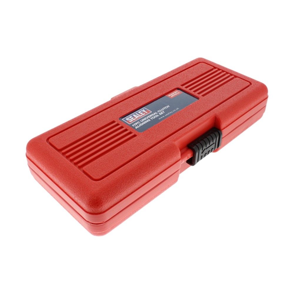 The Sealey Universal Clutch Aligning Tool Set (17pc) - AK710 is a robust kit for aligning clutch driven plates accurately during installation on manual transmission vehicles. Made from chemically blackened steel, the components resist corrosion and stand up to regular workshop use. The set helps centre the clutch plate to the pilot/spigot bearing and flywheel, allowing the gearbox input shaft to slide in smoothly and reducing the risk of damaging splines or bearings. With a versatile selection of adaptors arranged in a sturdy storage case, it covers a wide range of passenger cars and light commercial vehicles. Reliable and easy to use, the AK710 is suitable for professional mechanics and DIY users who want consistent, repeatable clutch alignment with minimal setup.
