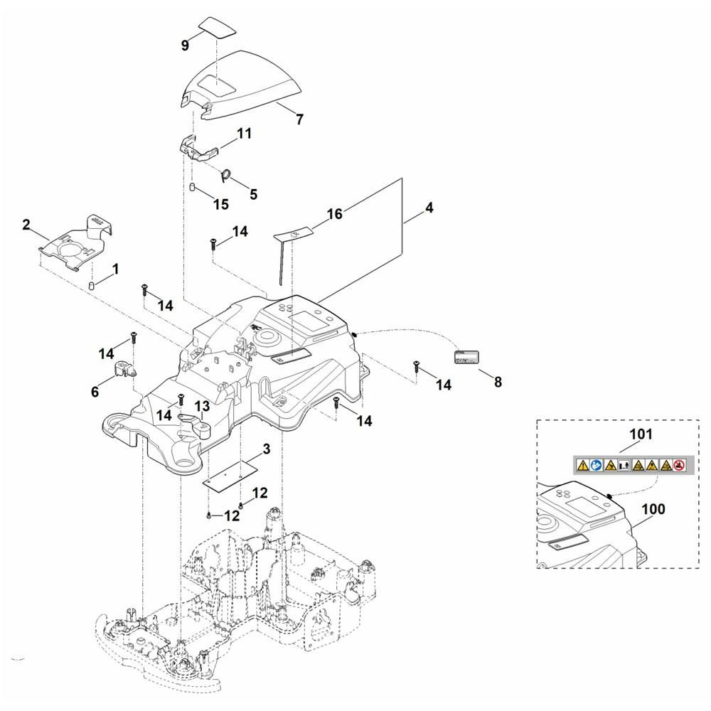 The Upper Housing Assembly for the Stihl RMI 422.0 Robotic Mower is designed to protect and encase the mower's internal components. This genuine Stihl part ensures durability and optimal performance, safeguarding the mower from environmental elements. It includes various components that contribute to the mower's efficient operation.