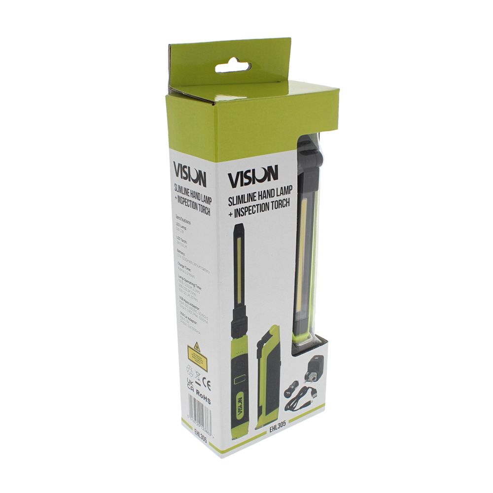 The Vision Slimline LED and Lamp + Inspection Torch is a compact, portable work light designed to help you see clearly in tight and awkward spaces. Built with a durable housing for everyday workshop use, it combines a high-output hand lamp with a slim 9 mm, 2 W inspection torch for pinpoint lighting. A strong magnetic base and hanging hook provide hands-free positioning on machinery, vehicles, racking, and benches. The dual flexible folding design lets you direct light exactly where it is needed. With three brightness settings (500, 250, and 50 lumens), a battery status indicator, and overload protection, it supports safe, reliable operation on site and in the garage. This Genuine Part (MPN: EHL305) suits maintenance and inspection tasks on construction equipment, garden machinery, and general plant tools.