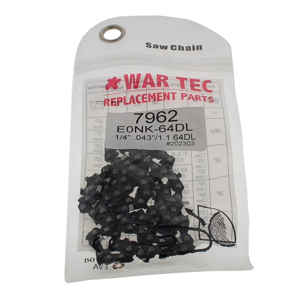 Chainsaw chain, saw chain, cutting chain, pruning chain, replacement chain, 12-inch chain (30.5 cm), 1/4" (6.35 mm) pitch chain, 0.043" (1.1 mm) gauge chain, 64DL chain.