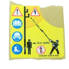 Replacement of worn, faded, or missing warning labels on Stihl HT series pole pruners used by arborists, grounds teams, gardeners, and DIY users. Ideal during servicing, refurbishment, or when preparing equipment for hire, audit, or site safety checks to ensure warnings remain legible and in the correct position on the machine.