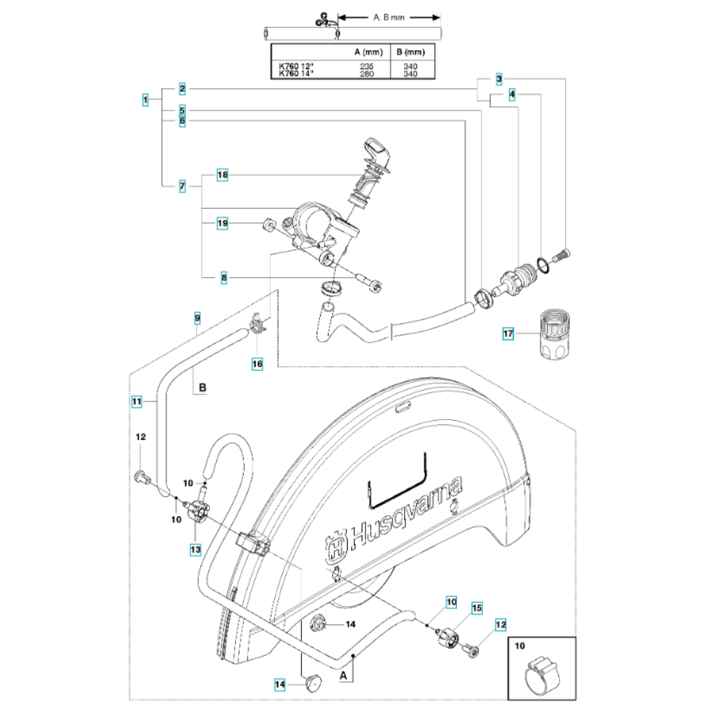 The Water Hose Assembly for the Husqvarna K760 II Disc Cutter is essential for efficient dust suppression and cooling during cutting operations. This assembly ensures optimal water flow to the cutting area, reducing dust and prolonging the life of the blade. Components include hoses, connectors, and clamps, designed for easy installation and reliable performance.