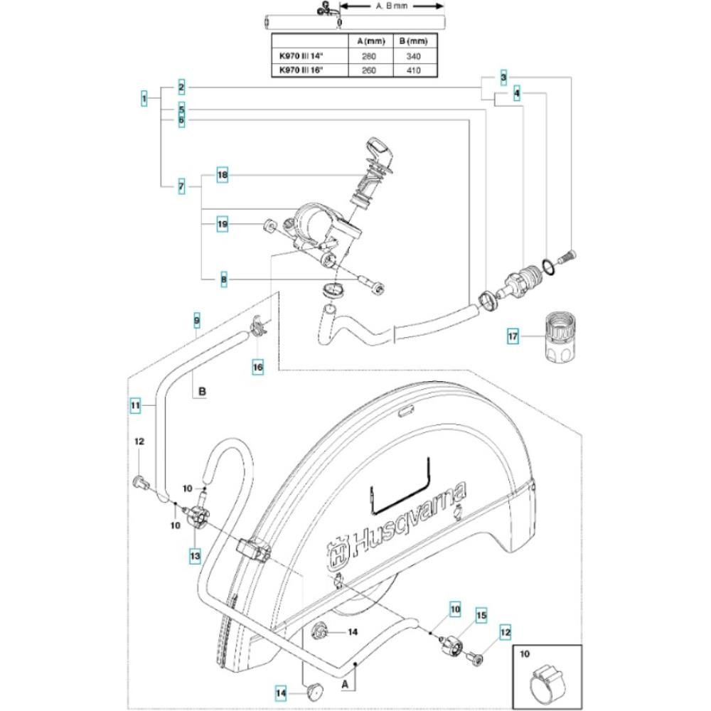 The Water Hose Assembly for the Husqvarna K970 Rescue III Disc Cutter is designed to ensure efficient water delivery during cutting operations. This assembly helps in cooling the blade and reducing dust, enhancing the cutter's performance and longevity. Components include hoses, connectors, and seals, all crafted to fit seamlessly with the K970 model.