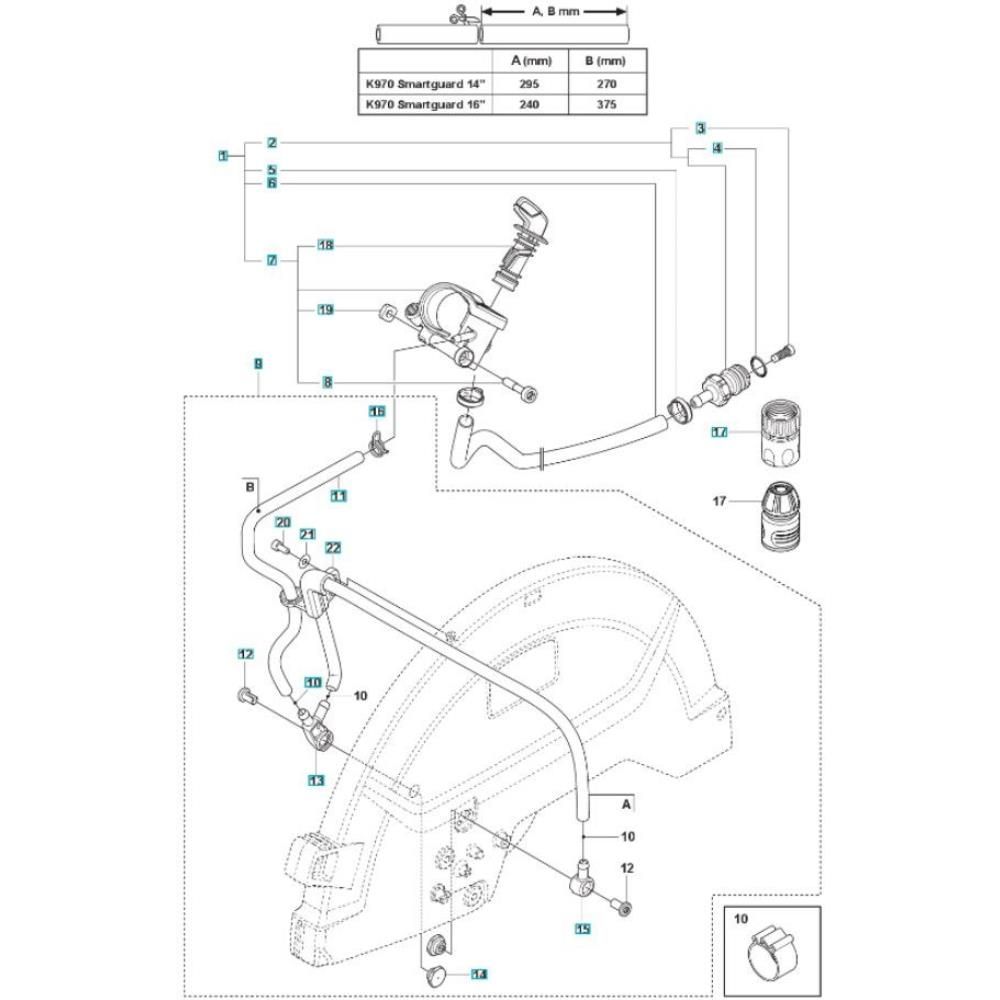 The Water Hose Assembly for the Husqvarna K970 SmartGuard Disc Cutter ensures efficient water delivery for dust suppression during cutting tasks. This assembly includes essential components such as hoses and connectors, designed to maintain optimal performance and prolong the life of your equipment. Suitable for various cutting applications, it helps in reducing dust and debris, ensuring a cleaner working environment.