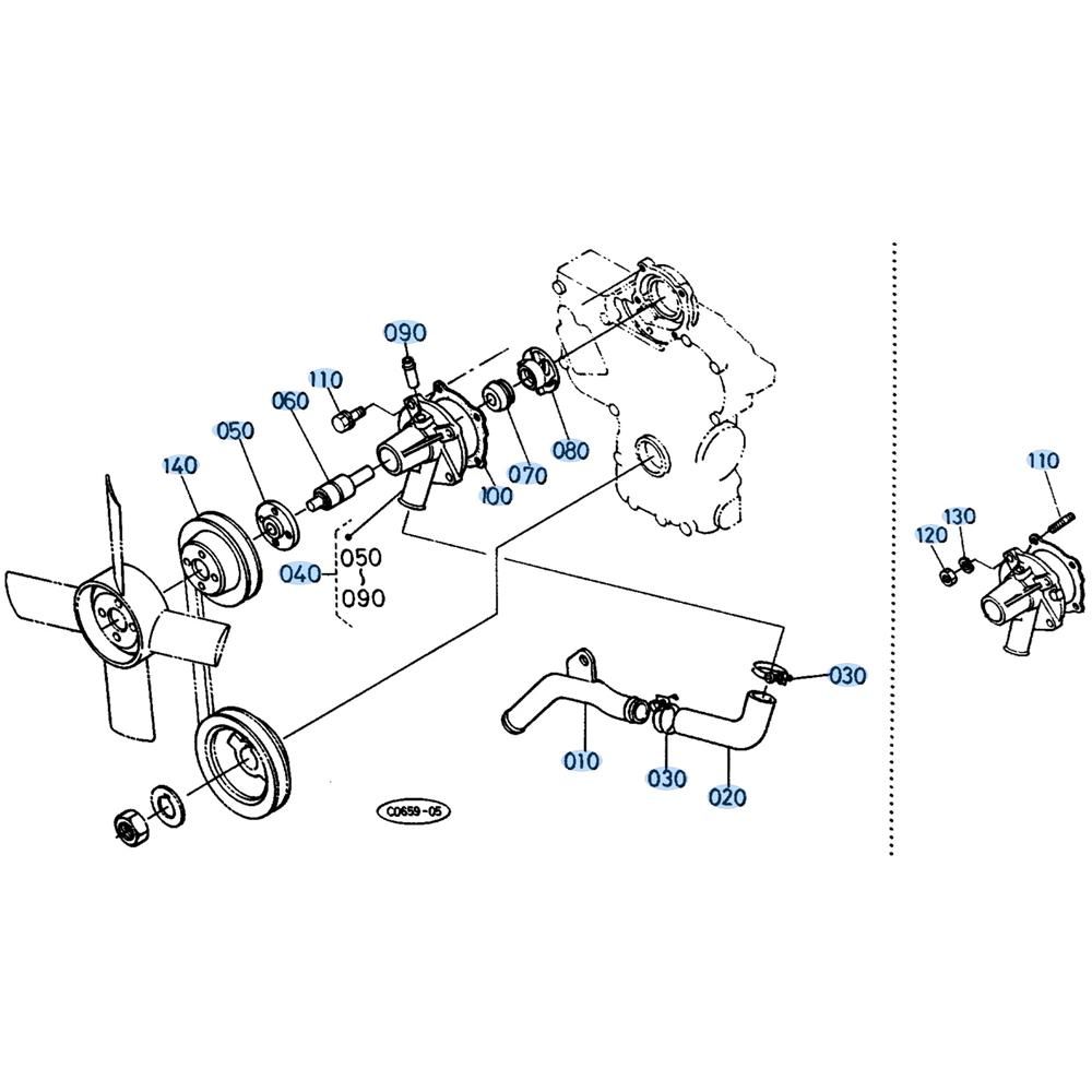 The Water Pump Assembly for the Kubota KH41 Mini Excavator is designed to ensure efficient cooling and optimal engine performance. This assembly includes key components such as gaskets, seals, and impellers, which work together to circulate coolant effectively. Genuine Kubota parts ensure compatibility and reliability, maintaining the excavator's operational efficiency.