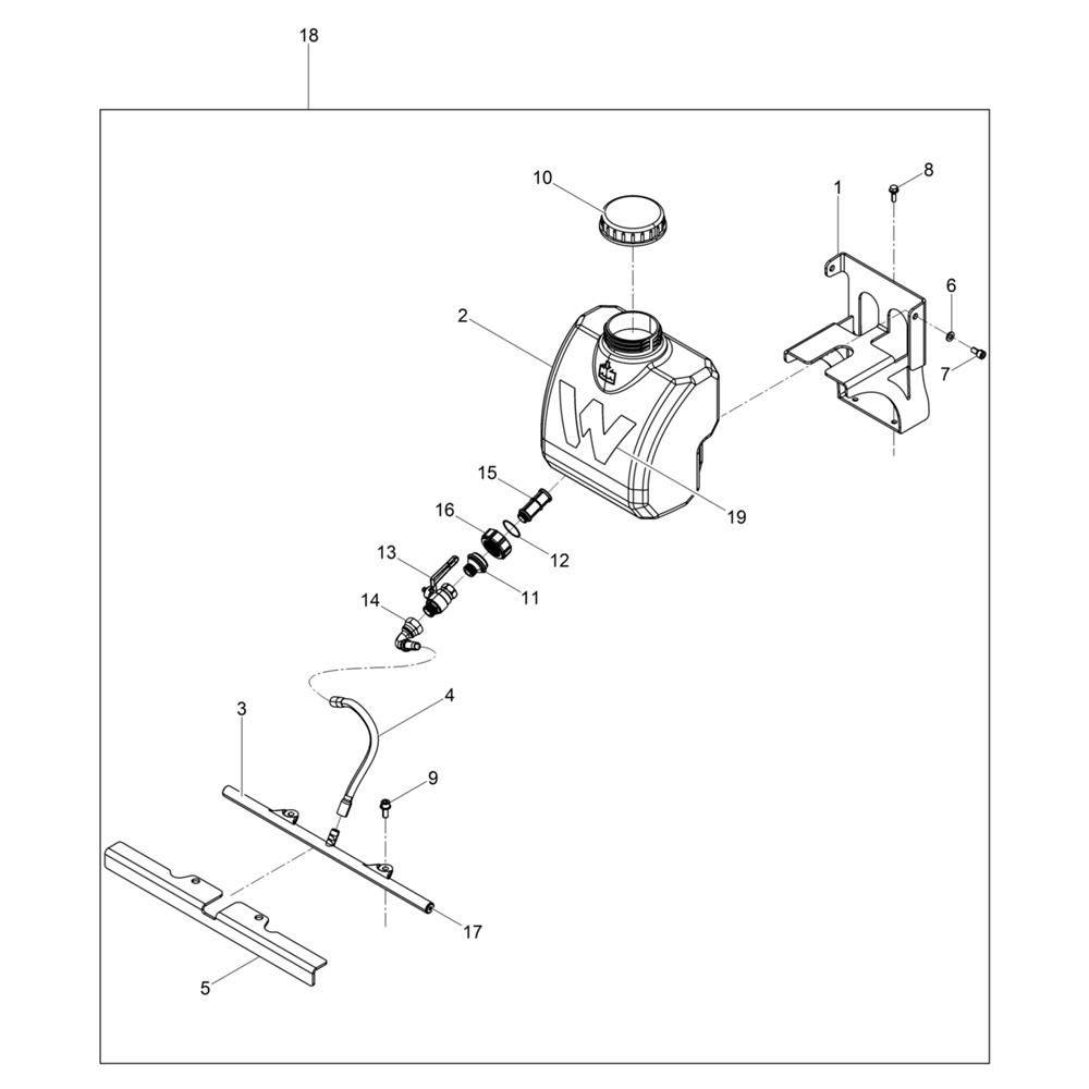 The Water System Assembly for the Wacker VP2050Aw Compactor includes essential components to ensure optimal performance and longevity. Designed to facilitate dust suppression and cooling during operation, this assembly helps maintain efficiency and safety. Components may include hoses, nozzles, and connectors, tailored to fit the Wacker Neuson Forward Plate Compactor.
