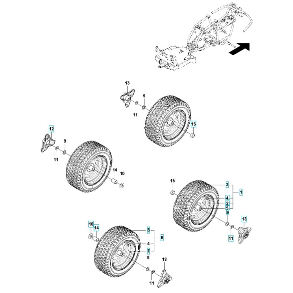 The Wheel Assembly for the Husqvarna R 112iC Ride-On Mower includes essential components to ensure smooth operation and manoeuvrability. Designed for optimal performance, this assembly helps maintain stability and control during mowing tasks. Genuine Husqvarna parts ensure compatibility and reliability, contributing to the longevity of your mower.