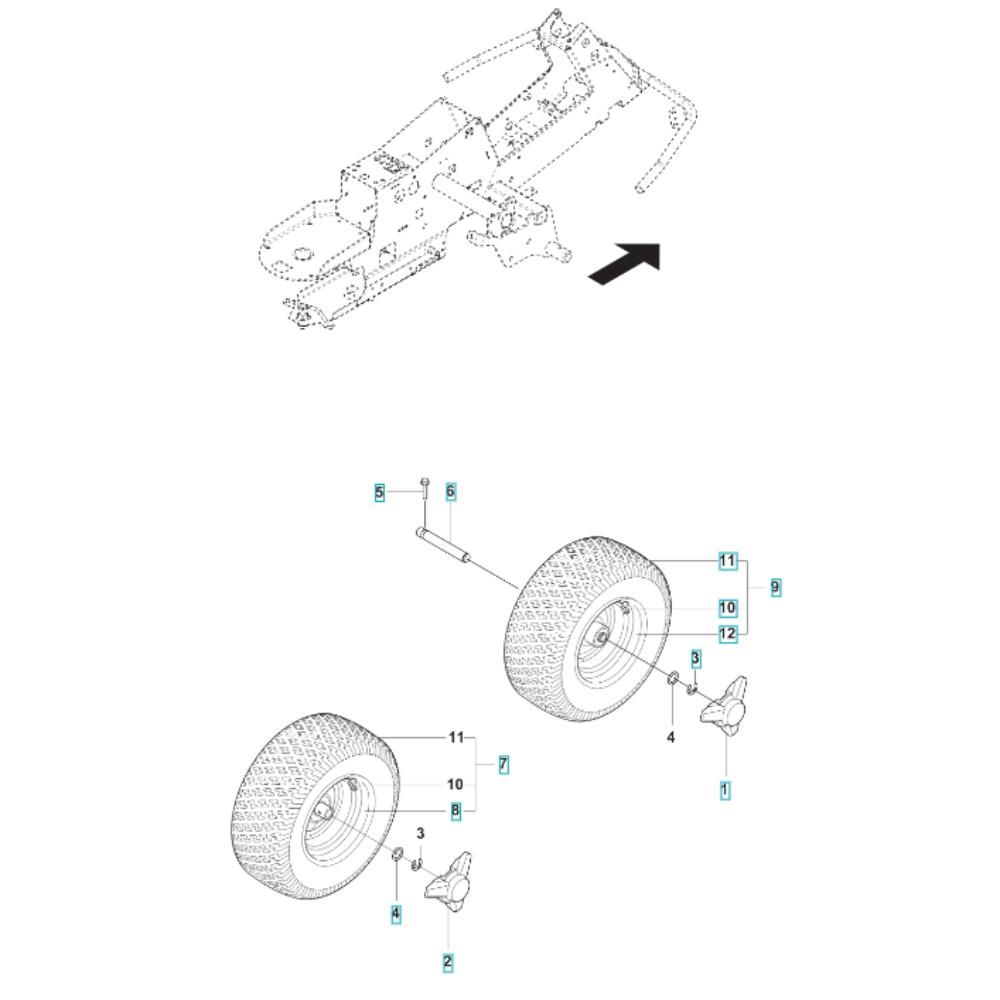 The Wheel Assembly for the Husqvarna R 200iX Ride-On Mower includes essential components to ensure smooth operation and manoeuvrability. Designed for optimal performance, the assembly helps maintain stability and traction on various terrains. Components may include tyres, rims, axles, and bearings, all tailored for the Husqvarna R 200iX model.