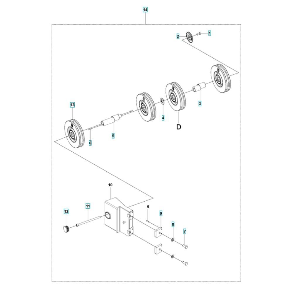 The Wheel Bracket Assembly for the Husqvarna CS 10 Wire Saw includes essential components designed to support and guide the wire during operation. This assembly ensures precise cutting and stability, contributing to the overall efficiency and longevity of the saw. Components typically include brackets, fasteners, and alignment guides.
