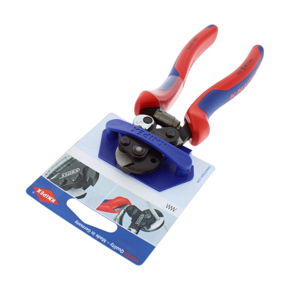 The Knipex 95 62 Series Wire Rope/Bowden Cable Cutter - 160mm is a robust tool designed for cutting high-strength wire ropes and cables. Constructed from durable ball bearing steel, this cutter features a compact yet powerful design, making it ideal for both professional tradespeople and DIY enthusiasts. The cutting edges are induction hardened to approximately 64 HRC, ensuring long-lasting sharpness and precision. With its lightweight build and integrated opening spring, it reduces physical effort by up to 30% compared to similar tools. This cutter is perfect for handling copper and aluminium cables, single and multiple wire cables, and ACSR cables.