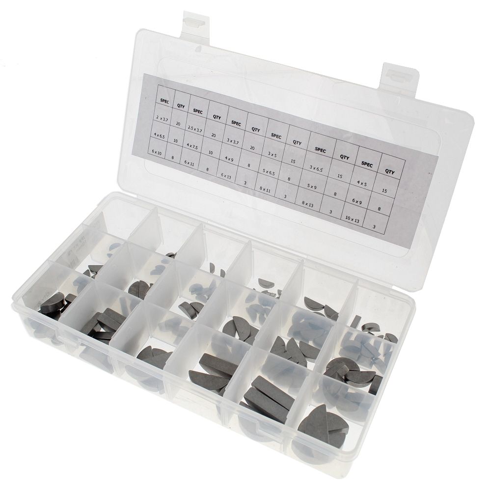 | Key Features | - Sizes from 2 mm to 13 mm for common keyway needs - Carbon steel for strength and wear resistance - Semicircular profile fits curved keyseats securely - Organised in a plastic case with size guide - Prevents slippage in pulleys, gears, and flywheels |